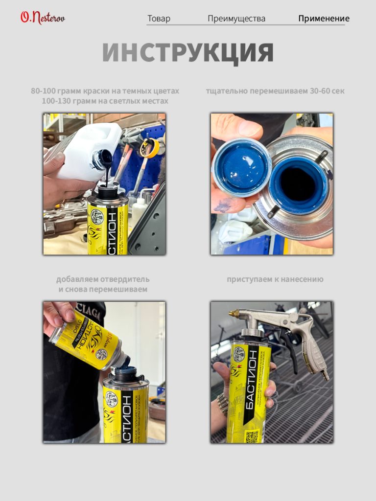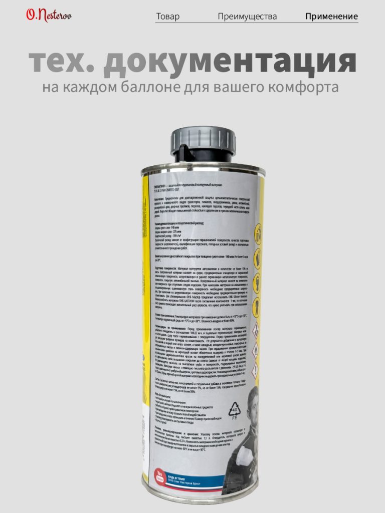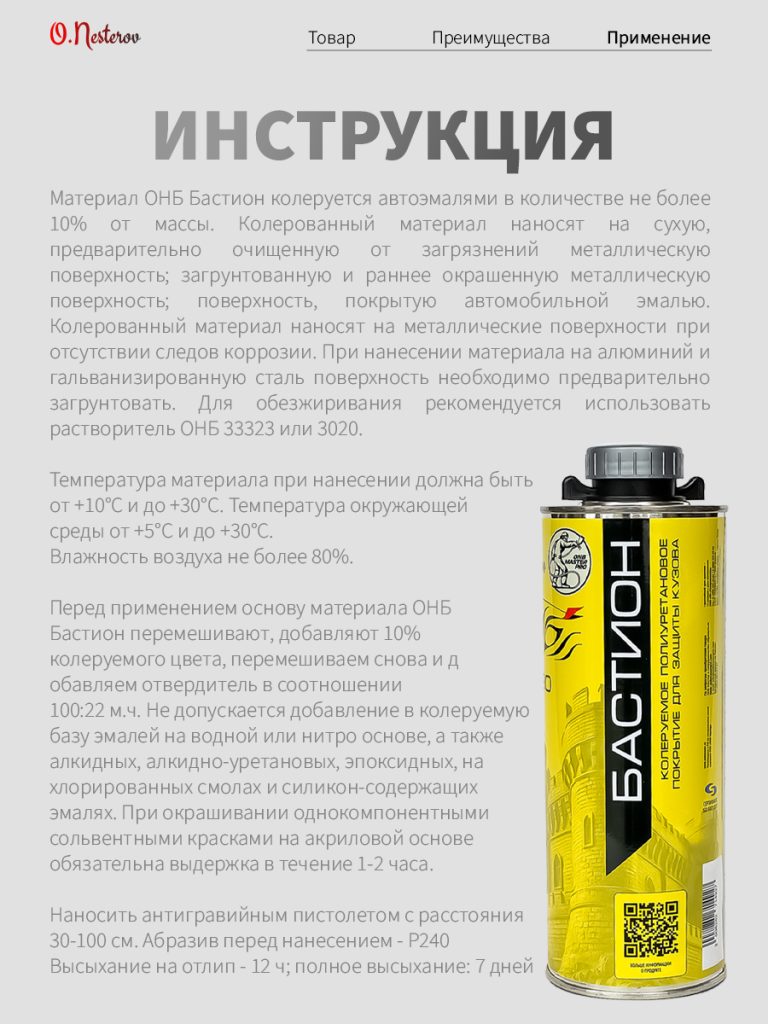Всем привет Олег Нестеров ✌️ покупал защитное полиуретановое покрытие ОНБ 8090 не профессионал в этом деле но скажу что очень удивился в использовании. Покрывал старенькии внедорожник terrano2. Материал просто класс очень хорошо наносится даже не для профессионала ,отлично. Коллеруется в цвет который надо работать с ним просто легко и комфортно без всяких нервов. Да и все материалы от онб практичные и качественные . ребята покупайте и не заморачивайтесь. Особое спасибо Олегу писал ему на почту спрашивал ныансы всё подробно объяснил как правильно делать большое ему спасибо. Всем удачи покупайте товары онб 👍 не пожалеете.