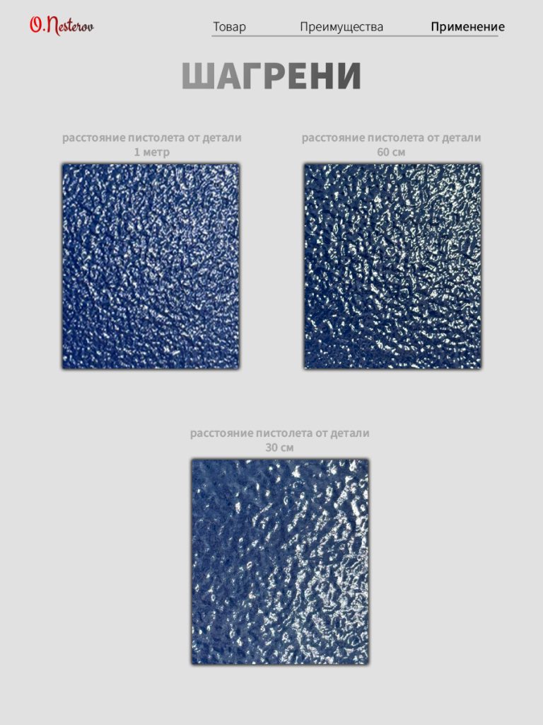 Материал отличный, наносил Китайским пистолетом Concorde sgu дюза 2,5 расстояние до объекта 20 см , давление воздуха 6, получил отличную , мелкую шагрень ( как и хотел) . Рекомендую.
